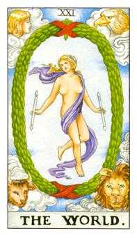 tai ženklas, kad svarbus ciklas baigėsi. Kitaip tariant? Jūs pakilote. Tradiciniuose šios kortos vaizdavimuose pavaizduota šokanti figūra pergalės vainike, laikanti dvi lazdeles ir apsupta paveikslėlių, vaizduojančių keturis fiksuotus Zodiako ženklus (kaip ir Fortūnos ratas). Tai kosminė harmonija, pusiausvyra ir meistriškumas.